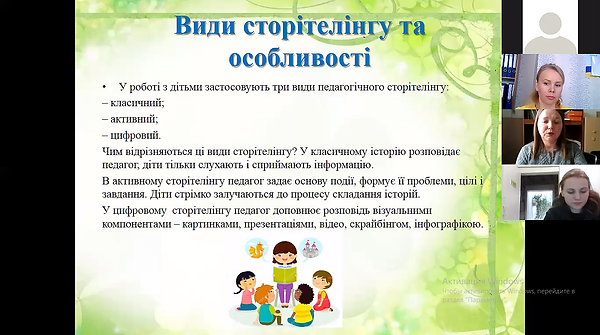 10 лютого 2021 року на базі Кролевецького закладу дошкільної освіти (ясла-садок) №5 було проведено онлайн-семінар на платформі ZOOM «Технологія сторітеллінг. Сторітеллінг: мистецтво розповідання, або як зацікавити й мотивувати дітей»